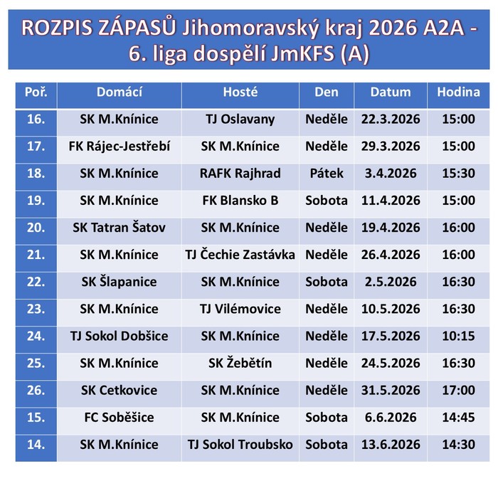 Úvod > Úřad > Aktuality > Tabulka zápasů SK Moravské Knínice - muži