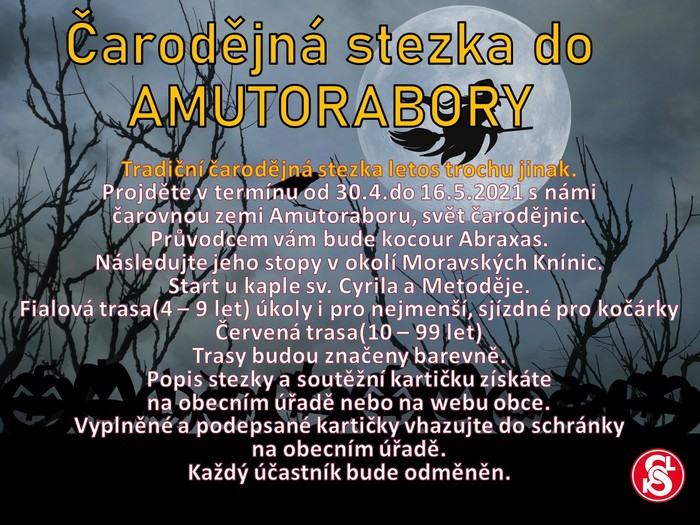Z důvodu protipandemických opatření se letos nemohla uskutečnit tradiční dubnová čarodějná stezka pro děti. Jako náhrada byla uspořádána Čarodějná stezka do Amutorabory také pro děti, ale tentokrát i pro dospělé. Hana Bravencová a Romana Helanová ve svém volnu stezku vytyčily, za což jim patří velký dík. Všichni účastníci, kteří odevzdali soutěžní kartičky s vyluštěným zaklínadlem, budou odměněni dárkem a sladkostí.