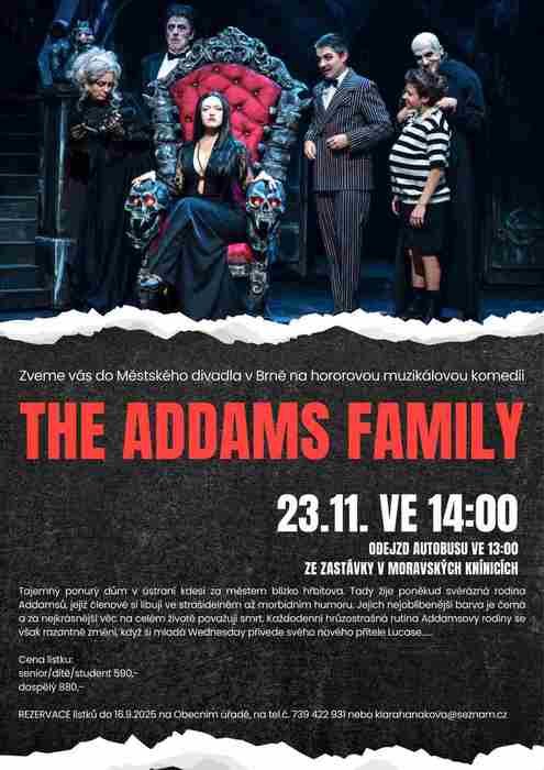 Výprava do Městského divadla v Brně na představení muzikálu THE ADDAMS FAMILY proběhla v neděli 23.11.2025. Zvláštní autobus odjížděl od zastávky v 13 hodin. Představení začínalo ve 14 hodin. Podívaná to byla úchvatná. Děti, rodiče i senioři byli nadšeni.