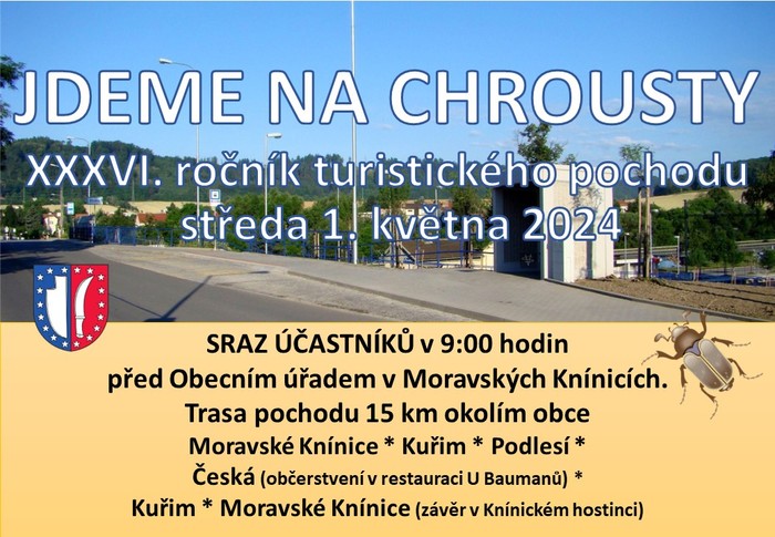 Letos se na prvního máje kníničtí turisté po třicáté šesté vypravili na tradiční pochod, nazvaný Jdeme na chrousty. Tentokrát byl naplánován po cyklostezce ke kuřimskému kostelu, kolem fary směrem k nádraží. Prošlo se pod železničním viaduktem, kolem základní školy na ulici Komenského. Dále okolo Záruby směrem na Podlesí. Tam se zamířilo k Lelekovicím, kde si děti i dospělí zasoutěžili ve sběru dřevěných "chroustů". K České se prošlo kolem průmyslové zóny a občerstvení proběhlo v hostinci U Baumanů. K cíli v Knínickém hostinci se prošlo pět přes Kuřim, Podhořím. K příjemnému závěrečnému posezení zahrál již tradičně Pekař a spol. Počet účastníků pochodu 56 turistů Délka trasy 18 km.
