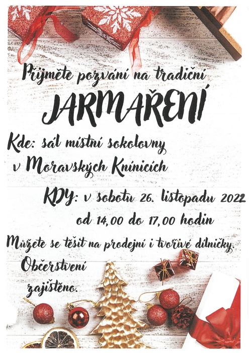 V sobotu 26. listopadu pořádaly knínické ženy v sokolovně tradiční Jarmaření - adventní dílny pro děti i dospělé. Občerstvení bylo opět bohaté. Prodejních stánků byla spousta s překrásnými výrobky.