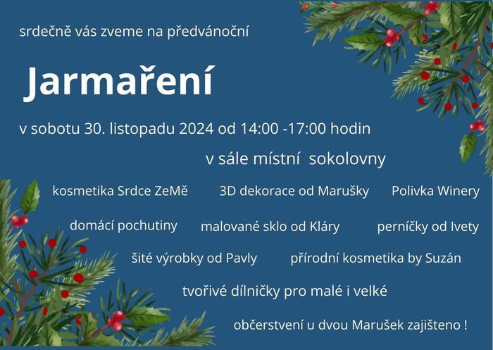 A co víc, rozkvete do podoby společenského setkávání všech věkových kategorií, s možností obdivovat zručnost výrobců perníčků (I. Svídová), krásu malovaného skla od Kláry, vánočních ozdob (F. Srnec, M. Benešová), látkového zboží od paní Čechové nebo otestovat výrobky přírodní kosmetiky by Suzán (Srdce ZeMě). V letošním roce byla i příležitost ochutnat produkty místních kulinářů (T. Bravenec, B. Kurka), med z knínických luhů a hájů (S. Krčma, M. Pěgřím) a vynikající vína z rodinného vinařství Polívka Winery. Hlavním programem ale zůstává tvoření pro děti různého věku. Ty měly možnost vyrobit si spoustu zajímavých dekorací jako malované domečky, přáníčka, andílky z vlny, hvězdičky z barevných drátků nebo nazdobit perníčky či malovat na tašky. K dispozici byla i zelená dílna nebo výroba přírodních dekorací. Na skvělé atmosféře se podílel také bohatě zásobený bar a jeho vždy usměvavá obsluha.