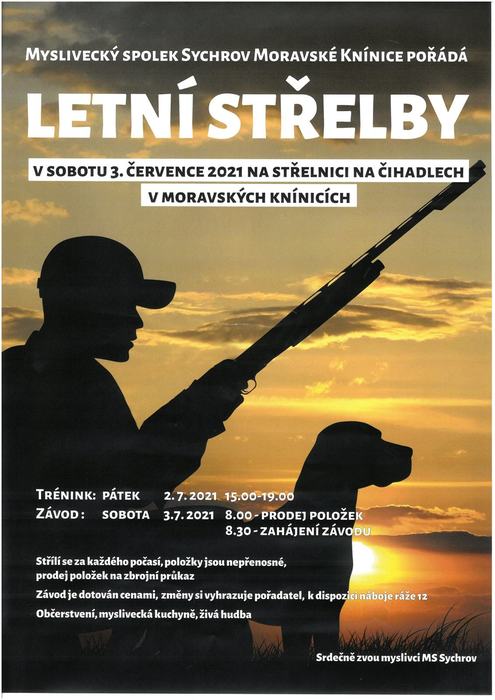 Tradiční závod v brokové střelbě na vysoké věži se uskutečnil v sobotu 3. července na myslivecké střelnici na Čihadle v Moravských Knínicích. Myslivecký spolek Sychrov Moravské Knínice připravil opět sportovní, ale i gastronomické hody. Občerstvení doplněné mysliveckou kuchyní bylo vynikající.