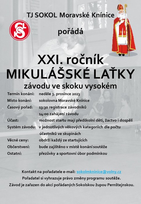 První adventní neděli mají příznivci skoku do výšky rezervovánu pro Mikulášskou laťku, kterou již léta pořádá v tomto termínu TJ Sokol Moravské Knínice pod patronací Sokolské župy Pernštejnské.
