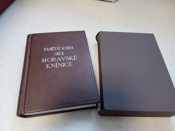 Novou kroniku dodala firma Jitka Balážová – KNIHAŘSTVÍ z Otrokovic. Je to kniha s koženou vazbou s pérovým hřbetem. Na titulní straně je zlatý nápis Pamětní kniha obce Moravské Knínice. Rozměry kroniky jsou 23 x 32,5 cm při 304 listech. Ke kronice je také ochranné pouzdro. Nová kronika vyšla na 8.150 Kč