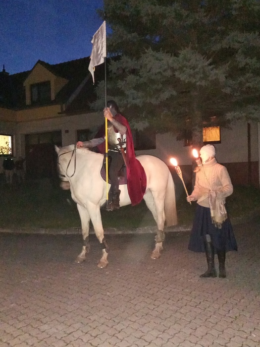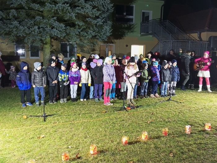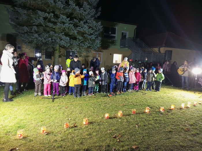 Touto pranostikou jsme zvali ke společnému Svatomartinskému průvodu s lucerničkami. Sešli jsme se ve čtvrtek v 17h před budovou školy a za svitu lampiónků jsme se vydali do Kouta, kde na nás již čekal Martin na svém bílém koni. Z pergamenu přečetl zdravici, popřál nám brzký příchod sněhu a poté nás doprovodil na zahradu mateřské školy. Školkáčci tam zazpívali zplna hrdla písničku, školáci nás vystoupením poučili trošičku.