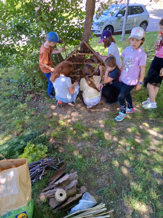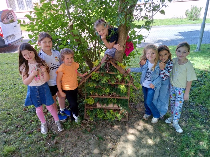 Minulý rok vyrobily děti ze školní družiny hmyzí hotel, který byl umístěn na hřišti v Koutě. Nyní nastal čas provést jeho údržbu a zhodnotit, kteří hmyzí hosté náš hotel využívají. Již delší dobu děti pozorují, že se v hotelu zabydleli mravenci, různí pavoučci, ploštice, ruměnice, berušky a mnoho dalších. Aby se hmyzí hosté cítili v hotelu dobře, bylo třeba jejich skrýš opravit. Děti nasbíraly a zpracovaly různé přírodniny, které byly doplněny do přihrádek hmyzího hotelu. S pomocí paní učitelky také opravily stříšku, která je nově pokryta kůrou.