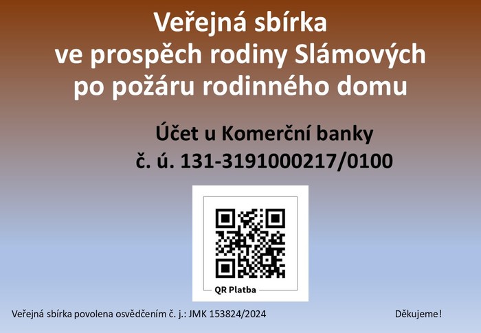 Obec vyhlásila veřejnou sbírku prostřednictvím sbírkového účtu u Komerční banky 131–3191000217/0100 a dvou fyzických pokladniček bude určena na rekonstrukci vyhořelé nemovitosti. Jedna pokladnička je a bude po celou dobu konání sbírky umístěna v místním obchodě Potraviny U Helanů. Druhá pokladnička bude přístupná během konání Obecního plesu dne 24.–25. ledna 2025 v budově sokolovny v Moravských Knínicích.